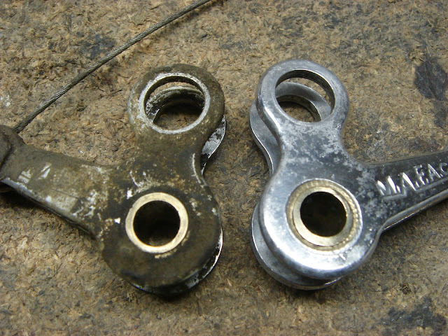 A bit of cleaning reveals the true beauty of these brakes. I thought they were made of iron, but it seems they 're aluminum. My luck! |